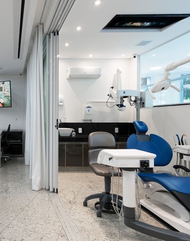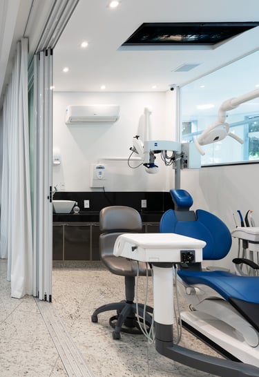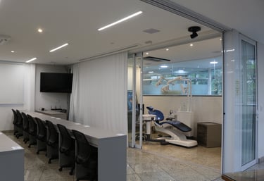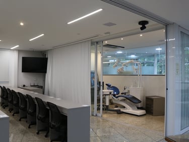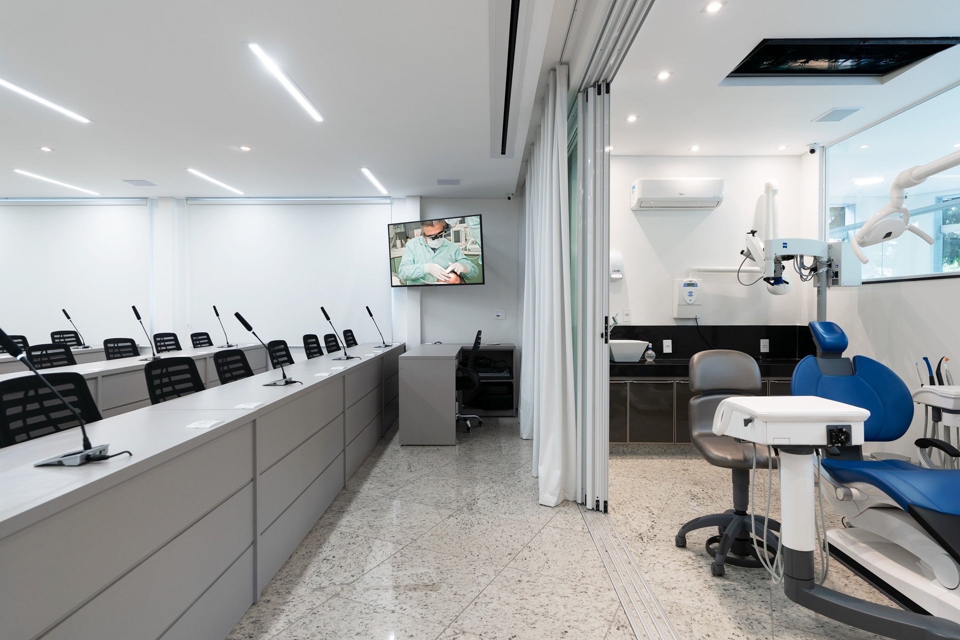 Sala equipada com cadeira odontológica para treinamentos práticos e demonstrações voltadas para dentistas.