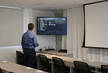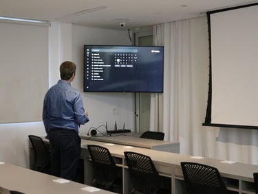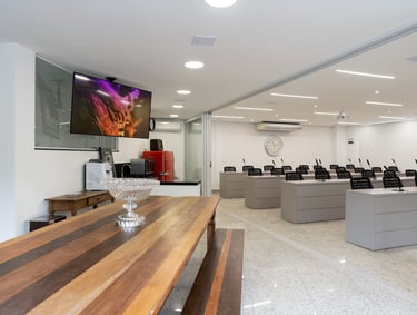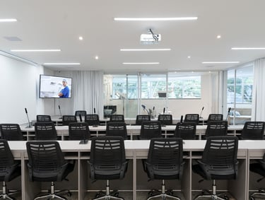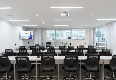 A sala acomoda até 32 participantes com conforto, é totalmente climatizada e conta com estrutura de multimídia completa, garantindo apresentações profissionais e uma experiência positiva para instrutores e alunos.