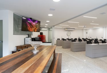 Sala de cursos para até 32 pessoas, climatizada, com multimídia completa e área de coffee break. Ideal para locação de sala de treinamento, workshops, palestras e eventos corporativos em Belo Horizonte.